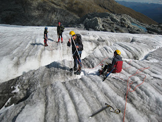 The weather was fine and by midday we were roped up to step off the rock onto the ice. Initially this is a bit hazardous as the ice is undercut and could potentially break off right where you are standing. Soon however we were established on the centre of the glacier snout, a couple of hundred metres above the ice cave at the terminus..