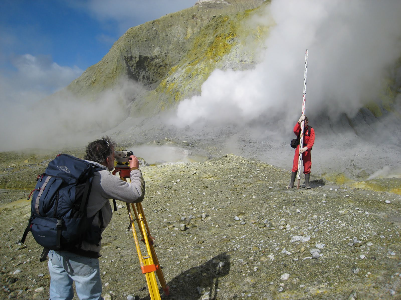 Past measurements have shown that the ground near the crater has been rising by two or three centimeters every three months for several years, mainly due to an increase in heat in the ground. From our measurements we found that the hottest area of ground near the most active fumaroles had risen up to a maximum of 50mm since the last survey, with the amount of uplift reducing quickly a short distance away. These results show continuity with the long term trend of uplift.