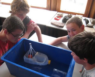 In this picture you can see how to make a vessel float even though it has a hole in the bottom (like the drill ship). The task also required the ‘ship’ to carry a rock and still float.
