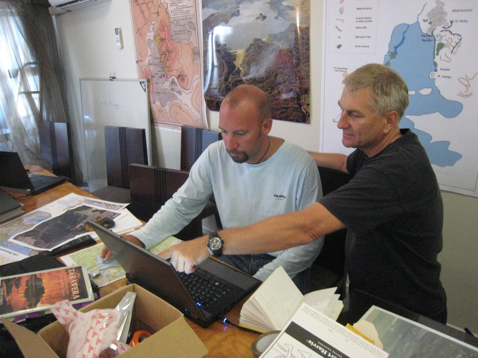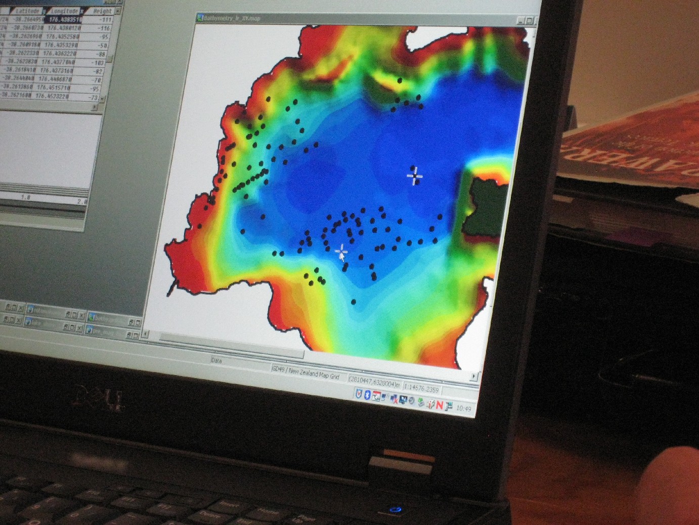 In this second image, Cornel de Ronde is discussing the magnetic anomalies map that Fabio has devised from a grid survey of the lake. The boat tows the magnetometer behind it as it travels up and down in a grid pattern. This was aligned mostly at right angles to the volcanic rift, with a few lines along it to ‘tie’ the readings together across the gaps. You can see the grid pattern as dark lines in the third picture. They more or less cover the lake area, and are about 100 metres apart.