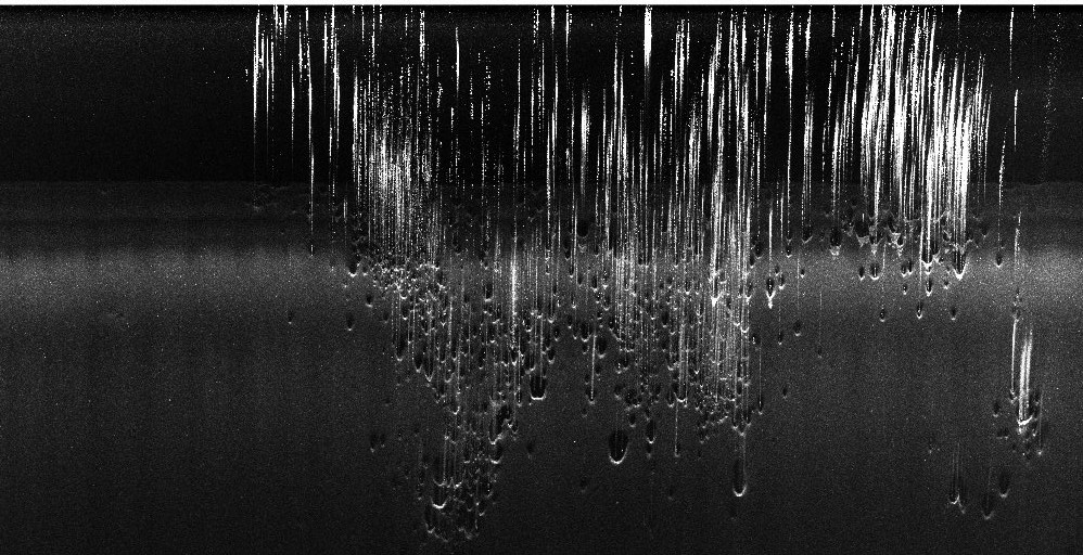 The image that Vicki has produced is an oblique side view of the lake floor, with a vertical scale of about 50 metres (the water depth). The amazing detail of the scan is visible in this image. You can see lots of little pock mark craters on the lake floor with streams of bubbles rising vertically above them. Obviously this area is hydrothermically very active. A lot of the emitted gas gets dissolved in the lake water before it reaches the surface, especially when it originates from vents at relatively deep levels in the water.
