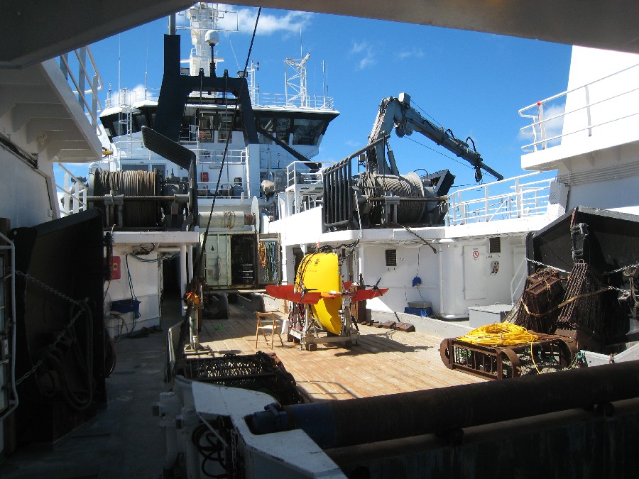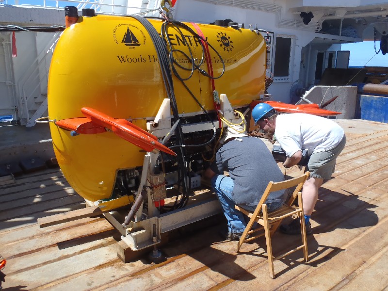 On Sentry’s initial dive a few days ago, its multibeam scanner stopped working. This feature is a very important part of the Sentry’s armoury of equipment. It is used to make very high resolution maps of the sea floor, which are extremely detailed because Sentry is travelling so close by.