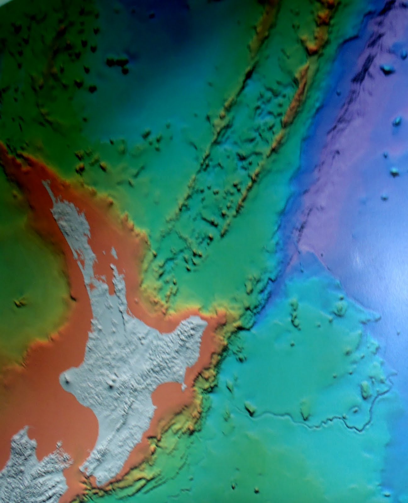 Here is a map of the ocean floor north of New Zealand. The different colours represent water depth, red and yellow are shallower than the blue and purple areas. The deep Kermadec Trench that marks the plate tectonic boundary is an obvious feature, with the Kermadec Ridge running parallel to the West (left) of the trench.