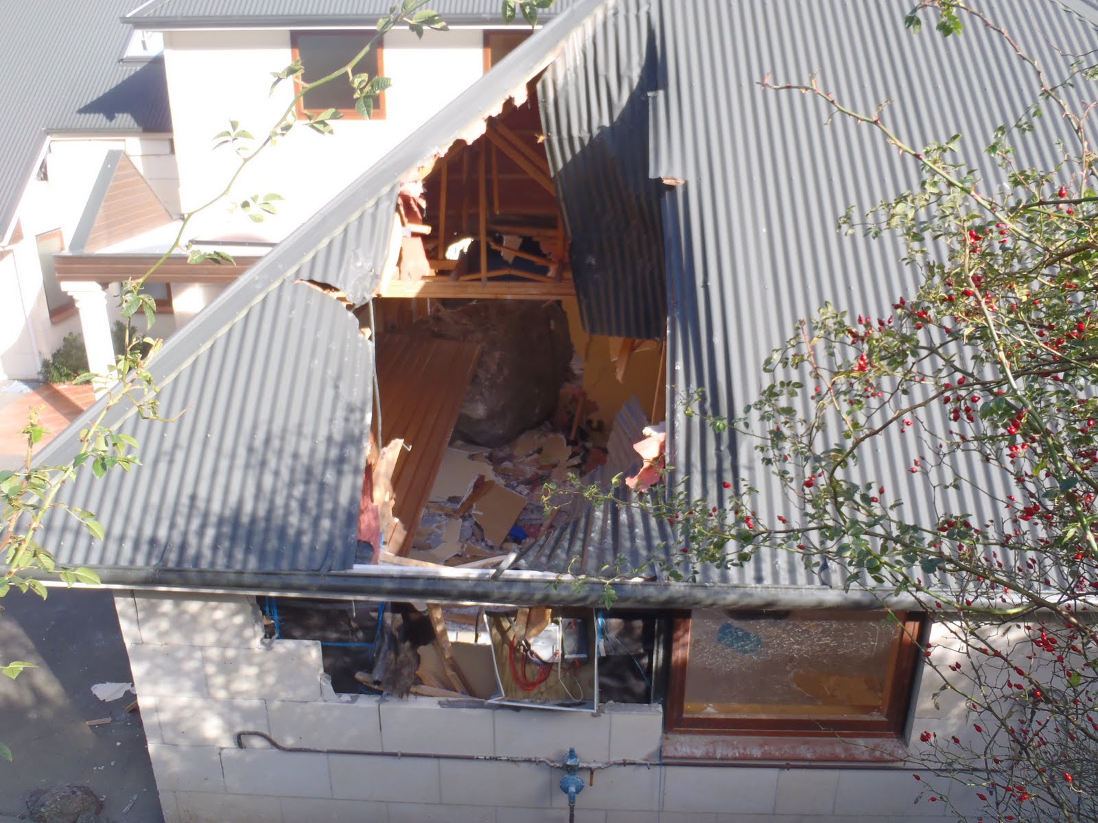 This property in Heathcote suffered severe damage from a large boulder that travelled roughly 500 metres from the slopes above, bouncing tens of metres at a time, and clearing a 2 metre fence before entering the house through the garage roof. (Photo 1).