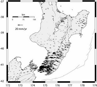 Over time these recordings show that the surface of the landscape is being deformed by tectonic movements. These measurements indicate that a large segment of the crust of the Australian Plate in the Lower North Island is stuck to the underlying slab of Pacific Plate, and is being dragged along to the west faster than the Hawkes Bay or East Cape areas. There have been different reasons for this proposed by scientists, but it is believed to be caused mainly by friction on the interface between the two plates.