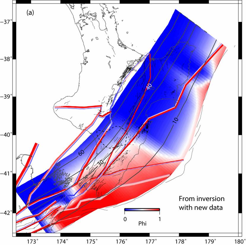 In this coloured image, the red colour indicates a high “slip rate deficit” or high degree of coupling between the subducting and overriding plates in the Lower North Island. This segment of stuck plate boundary is about 70 km wide and 140 km long.