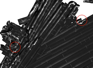 This close up of the side scan image  shows the curved overlapping terrace formation on the lower half below the blank, unscanned area. These features are very similar in general appearance to the photographically verified scans of the Pink Terraces found last summer.