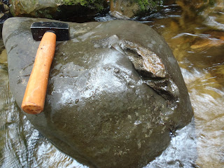 The photo shows Pete in 2009 with the prize find of the day moments after he pulled it out of the stream. It is a cluster of several reptile vertebrae, subsequently identified as belonging to an elasmosaur. Although heavy, Pete managed to carry it out, whereas most of the fossils we found that day had to be left in place.