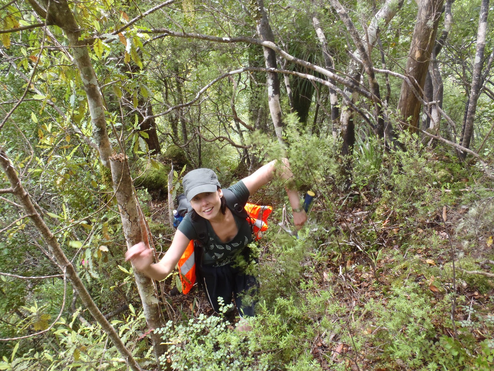 In this photo Marianna Terezow of GNS Science can be seen tackling the dense bush that must be traversed to access and return from the hidden valley.