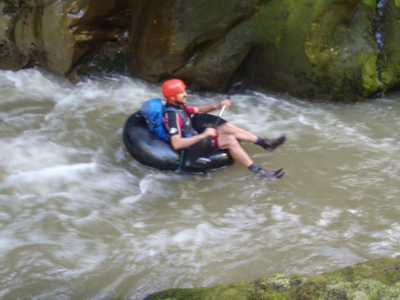 On our second day in the Maungataniwha Forest, some of us explored the lower Mangahouanga Stream using the well established kiwi river transport method of tyre tubes. This allowed us to visit parts of the river that would otherwise be very difficult to reach. Initial access to the river was via bush bashing through pine and then native forest, and down a steep climb to the water’s edge.