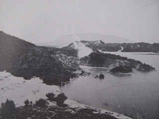A very significant feature that was revealed in last years’ bathymetric map was the ‘spit’ or promontary that is shown on early photographs of the Pink Terraces. It is extending into the lake in the middle distance of this photograph, not far to the east of the Pink Terraces visible in the left foreground. The spit rises several metres above water level. (Image courtesy of the Alexander Turnbull Library, Wellington)