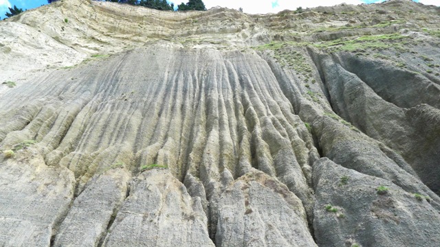 At the start, near Clifton, the cliffs are made up of thick river gravels, with thin layers of white pumice (volcanic ash) and occasional dark layers of plant material. Initially the beds are about 300 000 years old. Because they are dipping gently down to the north, you will pass further and further down the sequence as you walk along the beach to the south.and east. Here you can see the fluted erosion of the unconsolidated gravels caused by rainwater.