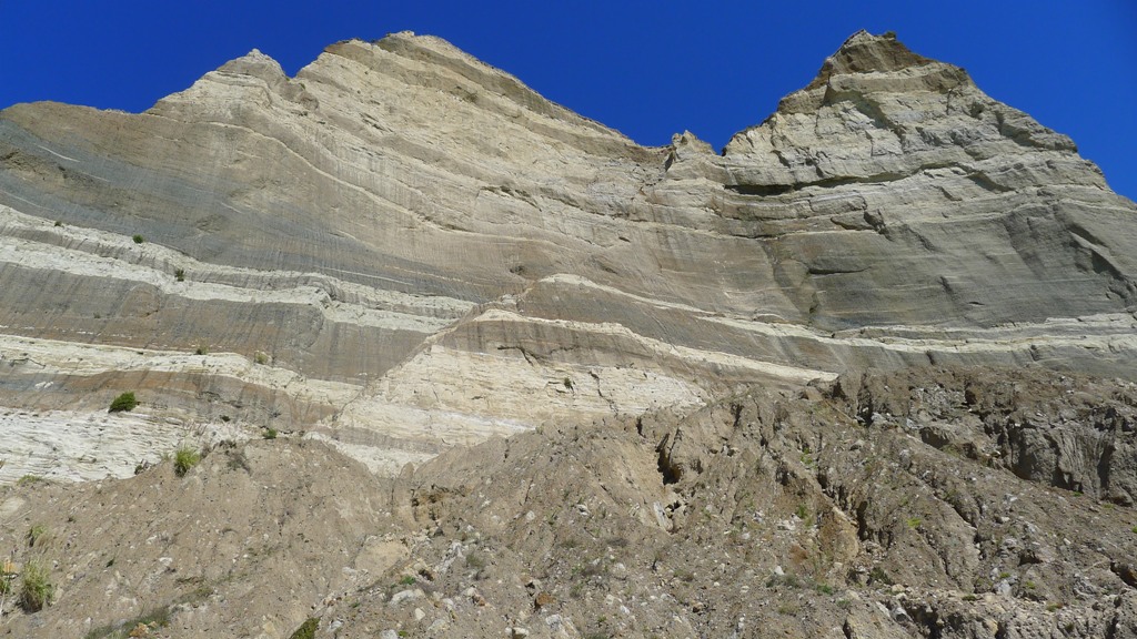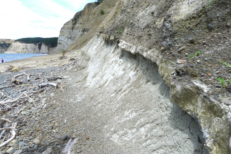 In this photo, a layer of light coloured volcanic ash separates overlying river gravels from marine mudstones below. Just above the ash is a very thin dark organic layer with plant remains in it.