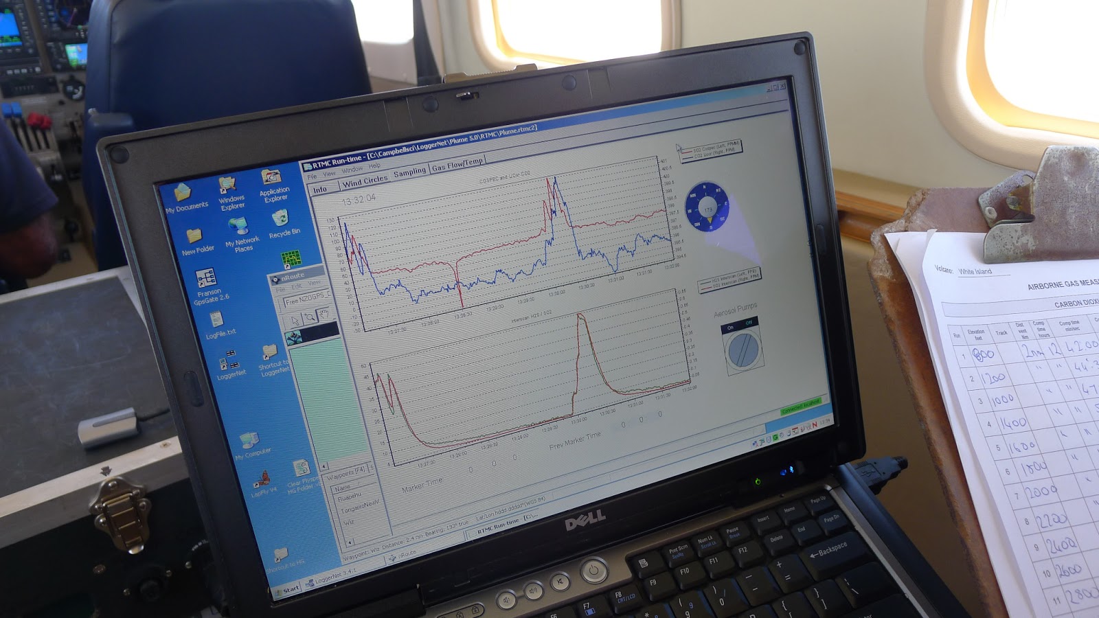 The plane is modified to allow the equipment to extend outside so that the measurements can be made. carbon dioxide (CO2), hydrogen sulphide (H2S) and sulphur dioxide (SO2) are the most common volcanic gases and are all measured during a gas flight.