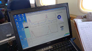 Next we flew under the plume at right angles to the wind direction and at the lowest permissible altitude of 200 feet. A Correlation Spectrometer (COSPEC) looks upwards through the plume and measures the amount of ultra violet light being absorbed by the sulphur dioxide. We passed under the plume several times in order to get an average reading. The wind speed is also taken into account to calculate the SO2 flux with this method.