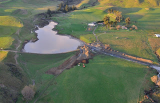Bell’s dam near Seddon. Damage (cracking) was sustained during the Cook Strait Earthquake and was exacerbated during subsequent aftershocks and also during the Lake Grassmere Earthquake. The channel was dug to partially drain the dam, to lessen potential flood risk to the town of Seddon, which is 10 km downstream to the NE.