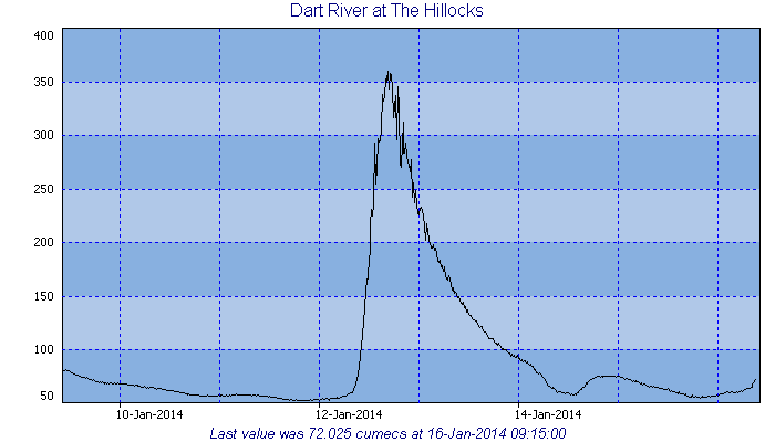 The second graph shows how the river flow responded to the rain, with a sharp peak and a gradual tailing off after the rain stopped falling. The tail is not entirely smooth with a dip when the flow gets below 100 cubic metres per second. This suggests that when the river level drops, the continuing input of debris at the slip impedes the flow for a while, until the blockage is overcome and the flow rate increases again.