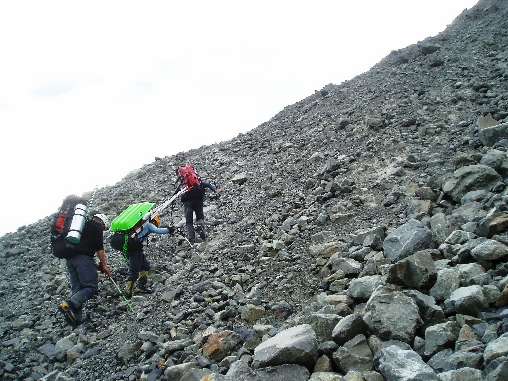 This is what the moraine wall of the Tasman Glacier looks like close up. The unstable terrain is very hard to travel over, especially when you are carrying heavy gear like this group of glaciologists.