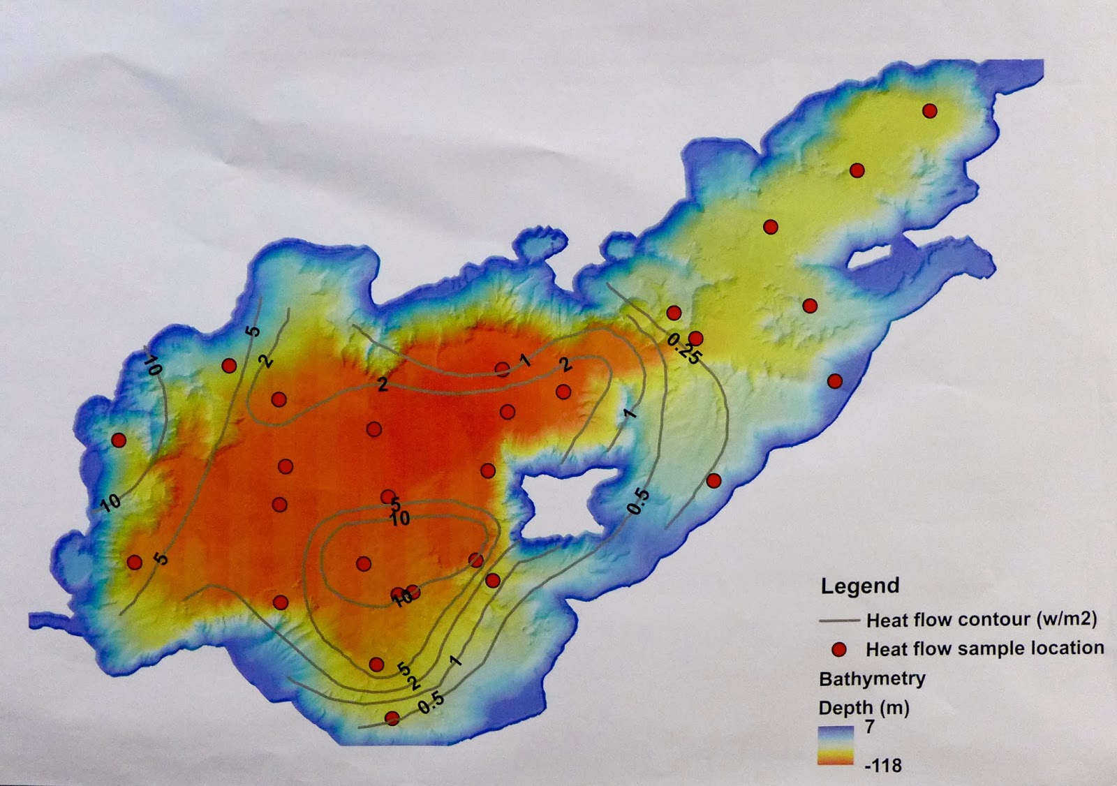 You can see how the areas of high heat flow in the map above correlate well with the map of gas bubbles recorded on the surface of the lake in 2012. This may seem obvious for a hydrothermal system, but gas plumes are not necessarily accompanied by heat.
