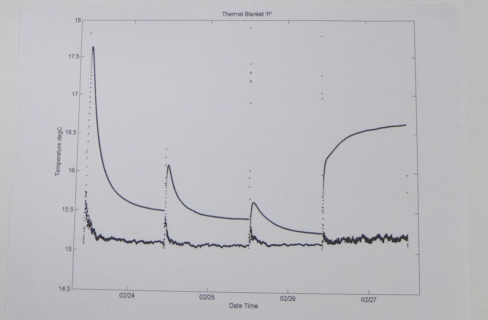In the image you can see the temperature curves for a blanket that has been deployed at 4 different locations over 4 days. The upper curve shows the data from the lake sediment recorded by thermistor under the blanket. The lower, darker curve is the (cooler) water temperature recorded by the top thermistor. You can see that it takes several hours for the readings to adjust to the lake floor temperature conditions. The last recording on the right hand side is very hot, so the thermistor records a rising temperature.