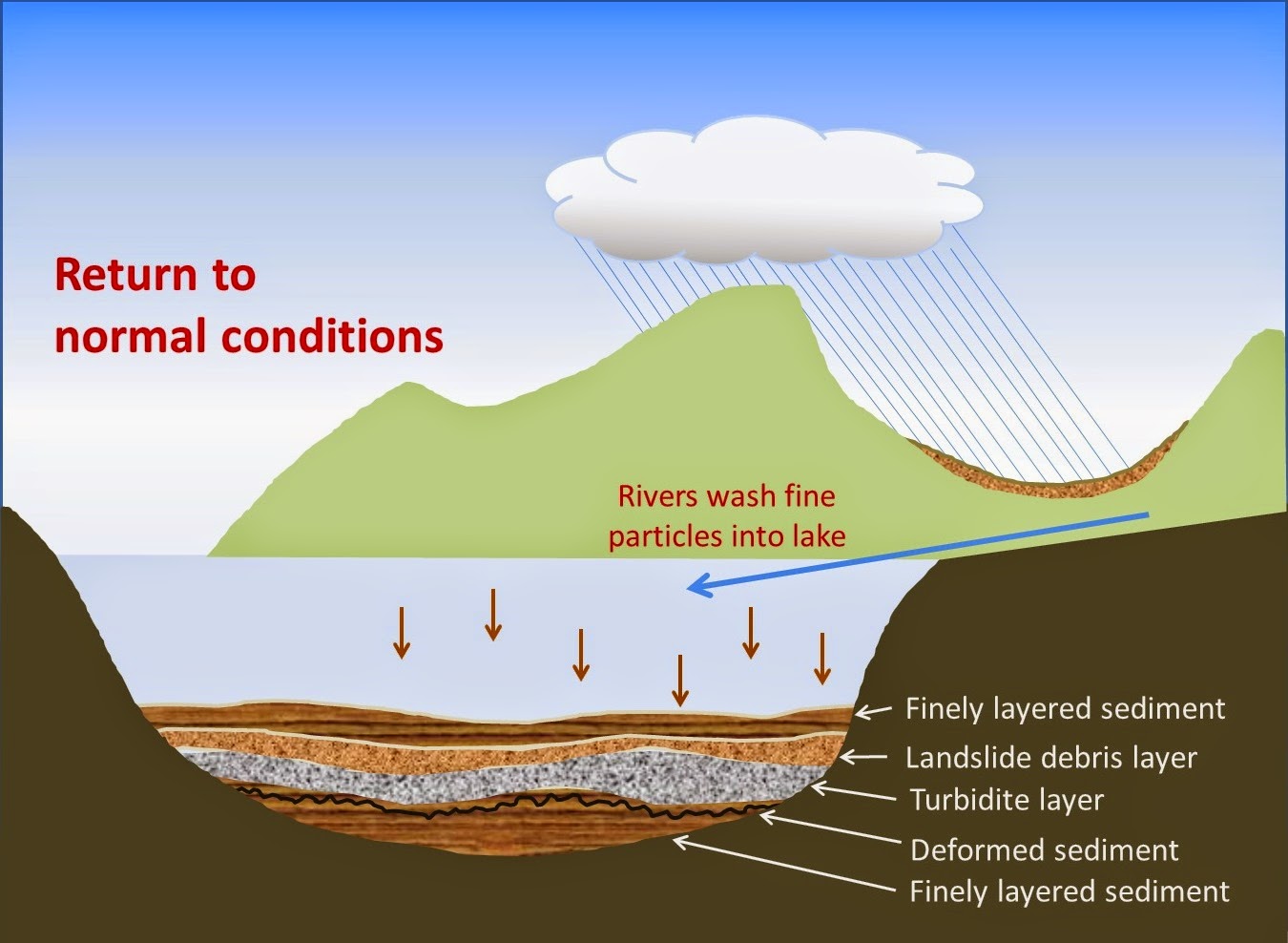 In the months and years following the earthquake, the landslide debris is gradually washed into the lake, to form a recognisable layers on top of the turbidite deposit.
